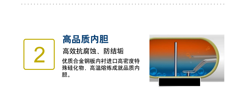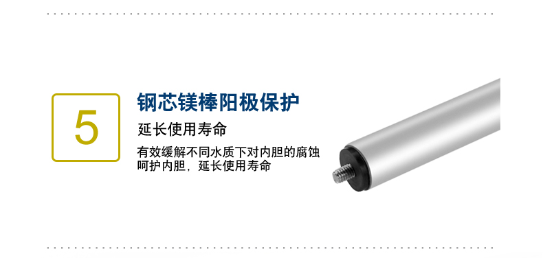 鋼芯強力陽極棒,有效緩解不同水質(zhì)下對內(nèi)膽的腐蝕,大大延長熱水器的使用壽命。