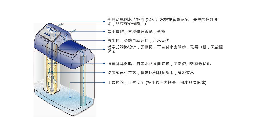 d、省鹽、效率高,自動(dòng)記憶客戶用水量及用水習(xí)慣,與客戶使用習(xí)慣相匹配的再生使用計(jì)算,能夠使機(jī)器處于最佳有效的高效運(yùn)轉(zhuǎn)狀態(tài)。逆流再生設(shè)計(jì),省鹽、省水效果好,再生時(shí)補(bǔ)水,平時(shí)鹽箱無水設(shè)計(jì),衛(wèi)生安全。排水部分獨(dú)特防溢閥設(shè)計(jì),避免排污虹吸引起的二次污染。桶底外加水路導(dǎo)向裝置,使濾料使用效率最大化,效果最好。