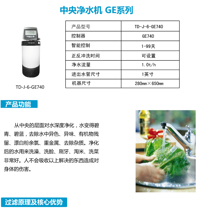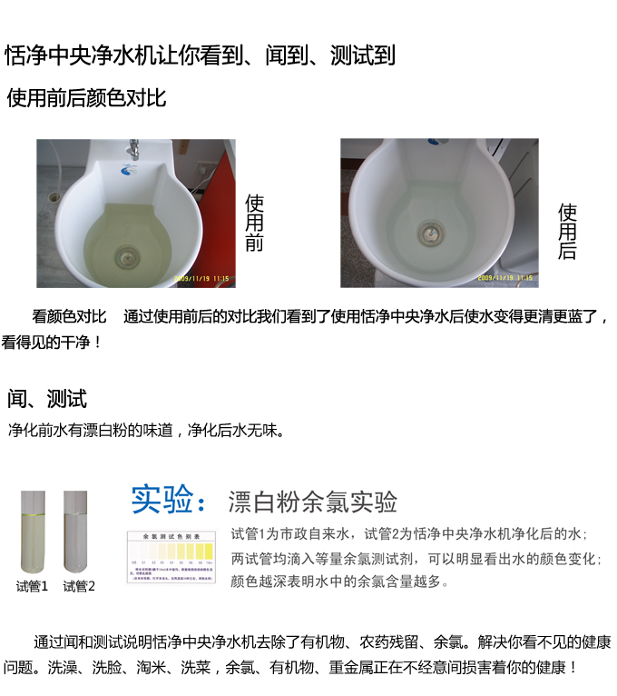 恬凈中央凈水機有效去除水中的異色、異味;進一步濾除水中微小雜質(zhì)、膠狀體;去除水中的漂白粉余氯、農(nóng)藥、重金屬;保留對人體有益的礦物質(zhì)。使水變得碧清、碧藍,去除對人體有害的物質(zhì)。