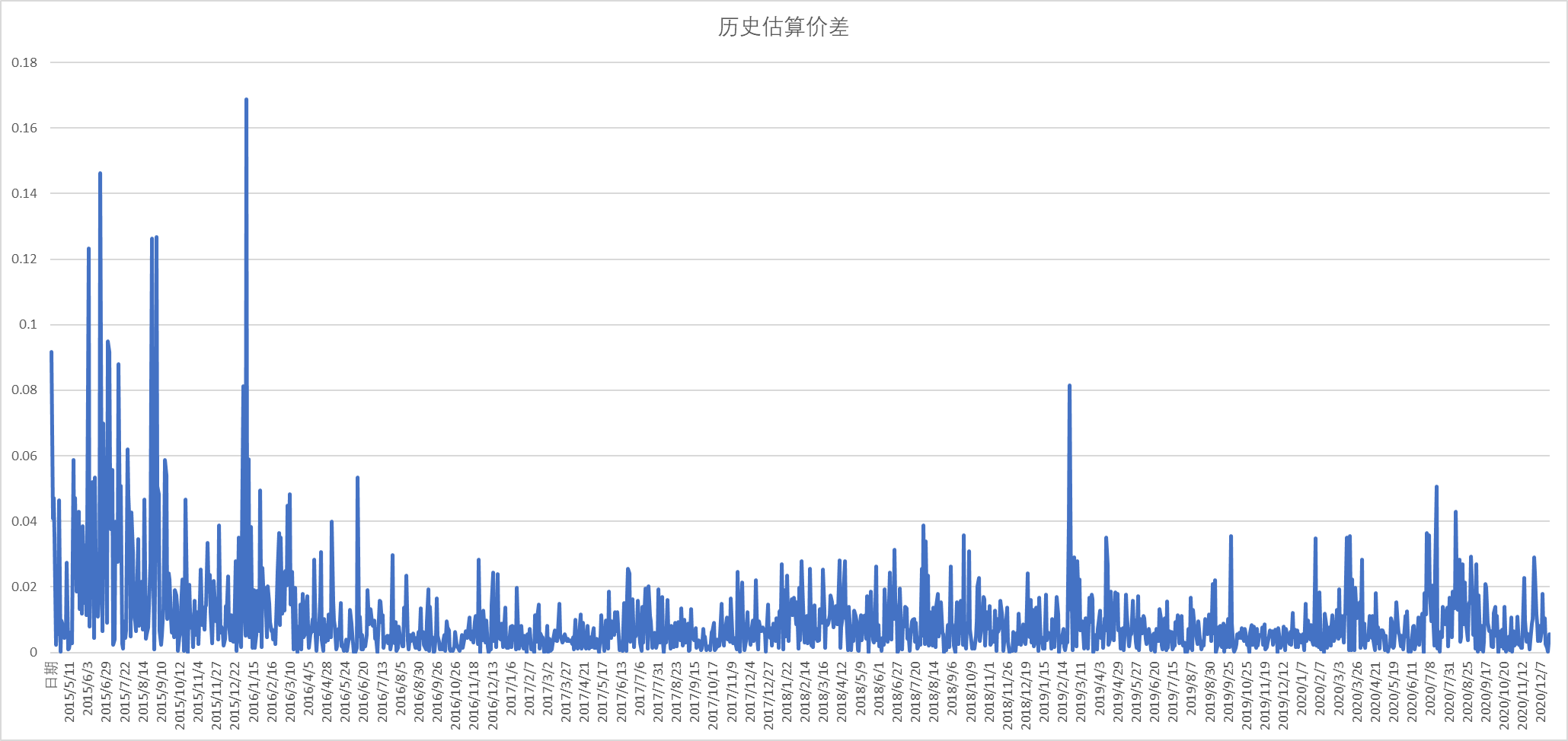 上圖為2015年4月16日到2020年12月17日期間,上證50當(dāng)月期貨合約的收盤價(jià)和結(jié)算價(jià)的“差價(jià)金額”占期貨持有成本的比例,這個(gè)比例也代表結(jié)算差價(jià)額外帶來(lái)的盈虧率。從2015年到2020年期間,期貨因?yàn)槠涔浪阋?guī)則,往往會(huì)帶來(lái)平均1%的利潤(rùn)差距,有時(shí)最高甚至?xí)?/font>16%的差異。當(dāng)然,基金不一定全倉(cāng)持有期貨,它們更多是持有一定比例的期貨和現(xiàn)貨、期權(quán)等其它投資品種作對(duì)沖。因此,基金持有的期貨越多,結(jié)算價(jià)帶來(lái)的估算誤差就會(huì)更大。