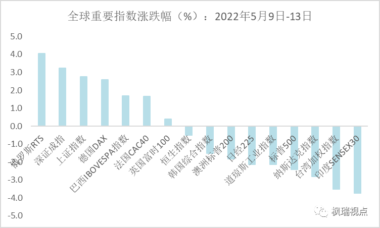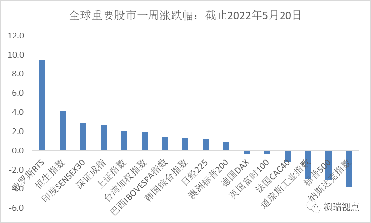 國內(nèi)房地產(chǎn)市場是焦點(diǎn),國際上的焦點(diǎn)是美國股市的暴跌。上周,美國三大股指道瓊斯指數(shù)、標(biāo)普500指數(shù)和納斯達(dá)克指數(shù)分別下跌2.9%、3%和3.9%,在全球16個(gè)主要國家和地區(qū)指數(shù)中居于跌幅榜前列。而上周領(lǐng)漲全球的是俄羅斯股指,一周上漲9.5%(圖一)。美國和俄羅斯截然相反的股市表現(xiàn)是不是意味著俄烏沖突勝負(fù)已定呢?