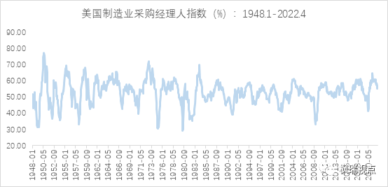 美國制造業(yè)采購經(jīng)理人指數(shù)在2021年3月達(dá)到疫情以來的最高點(diǎn)—64.7之后一路下行,至今已下行了一年多的時(shí)間了。而非制造業(yè)采購經(jīng)理人指數(shù)在2021年11月達(dá)到最高點(diǎn)—69.1,之后也開啟下行至今。