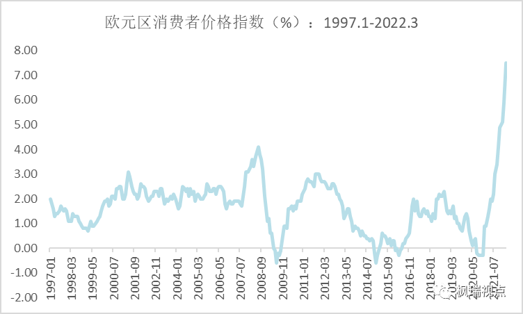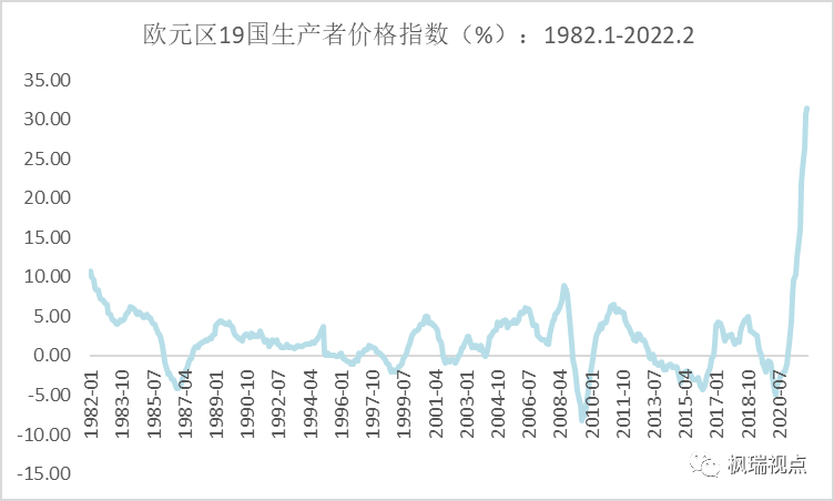 讓歐央行和美聯(lián)儲采取超預(yù)期的收緊流動性的原因只有一個,就是通脹。最新公布的2022年3月歐元區(qū)消費(fèi)者價(jià)格指數(shù)同比漲幅為7.5%,為1997年1月以來的最高水平(圖一)。而2022年2月的生產(chǎn)者價(jià)格指數(shù)的同比漲幅則達(dá)到31.7%,是1982年1月以來的最高水平(圖二)。