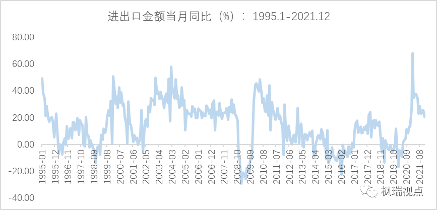 在這三項中,出口對經(jīng)濟的貢獻可能會小于2021年和2020年。2020年和2021年我國貨物貿(mào)易進出口總值分別增長4%和21.4%。2020年疫情之下,進出口增速曾一度下跌到-16%。隨后因為歐美國家爆發(fā)新冠危機,訂單從這些國家轉移到中國,進出口增速開始快速反彈。到2020年12月,恢復到13.4%的同比增速,在2021年繼續(xù)保持良好增速(圖一)。