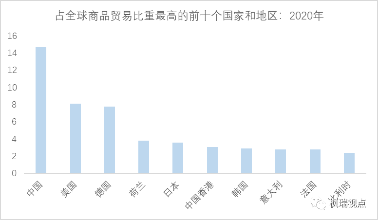 根據(jù)聯(lián)合國貿(mào)發(fā)組織,2020年中國在全球貿(mào)易中的比重提升到14.7%。這一數(shù)字遠遠超過排名第二的美國,其占比為8.1%(圖二)。