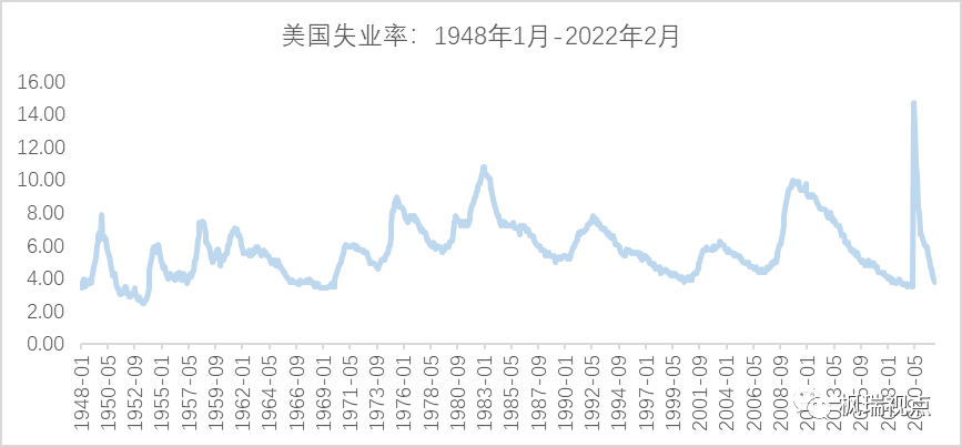 2022年2月份,美國失業(yè)率從1月份的4%下降到3.8%,僅比疫情發(fā)生前的2019年12月份的失業(yè)率3.5%高出0.3個百分點(圖三)。