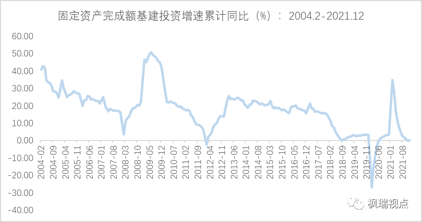 2021年基建投資增速處在歷史較低水平(圖四)。截止2021年12月底,2022年基建投資累計增速為0.21%。2004年以來,除去2020年2月到6月受到新冠危機的影響以及2012年2月基建投資增速為負數(shù)之外,2021年12月的增速是歷史最低水平。