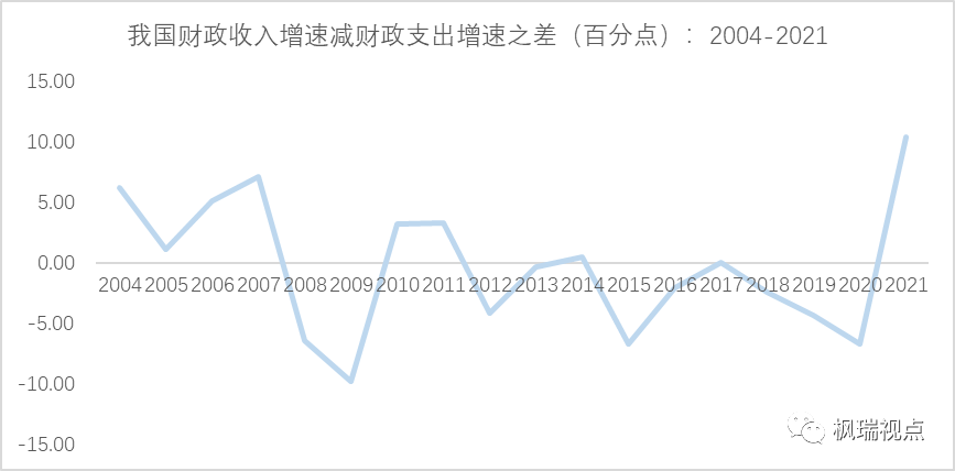 2021年財政收入增速為10.7%,是自2013年以來最高增速。2020年受疫情影響財政收入增速為-3.9%,2020年和2021年兩年平均增速為6.8%,這是2017年以來的最快增速。而2021年財政支出增速僅為0.3%,為2004年以來最低的增速(圖五)。因此,2021年財政收入增速減去財政支出增速的差是2004年以來的最大值(圖六)。