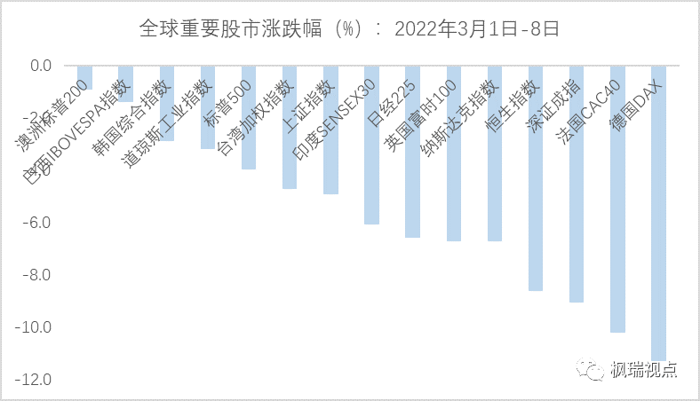 當前,戰(zhàn)爭剛剛開始,勝負未定,而且戰(zhàn)爭走勢往往一波三折,很難預判。但是全球股市在過去7個交易日的表現(xiàn),一定程度上也反應了戰(zhàn)爭中誰會獲益,誰會受損。