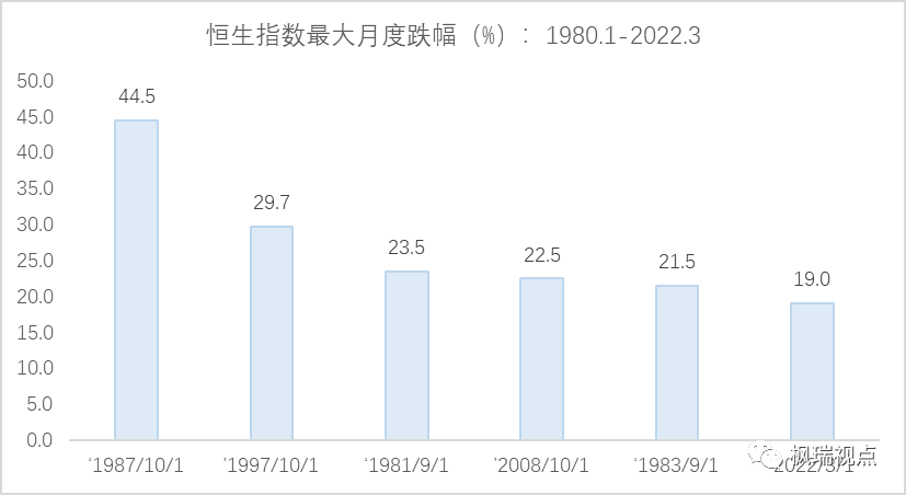 從1980年1月到2022年3月,在43年2個月的時間里,恒生指數(shù)月度跌幅超過20%的情況只發(fā)生過五次,分別是1981年9月、1983年9月、1987年10月、1997年10月和2008年10月(圖一)。