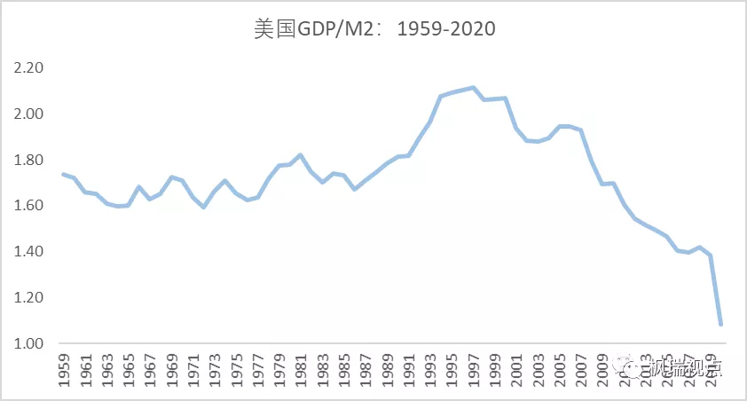 我們用美國GDP除以年末廣義貨幣存量M2得到單位貨幣投入所能產(chǎn)出的GDP(圖一),發(fā)現(xiàn)該比值在1997年達(dá)到頂峰2.12后就緩慢下跌,而最近幾年更是跳水式下跌。2020年,該比值下降到接近1.08。