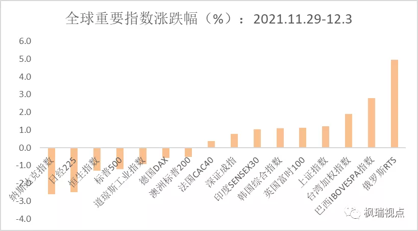 納斯達克指數(shù)跌幅居前因受到美聯(lián)儲收縮流動性預期影響。而俄羅斯和巴西漲幅居前,分別受到石油和鐵礦石價格上漲的推動。