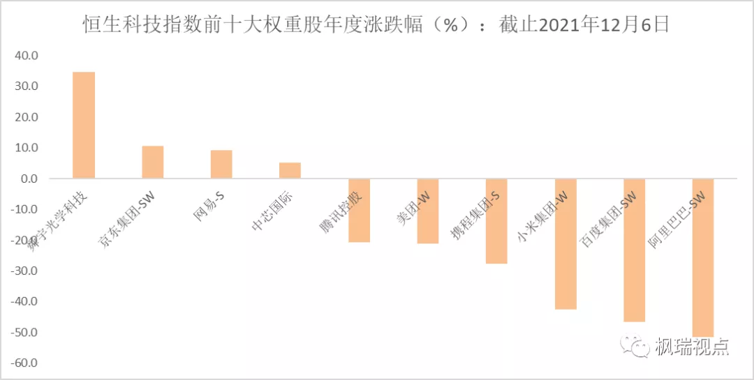 今年全球主要國家和地區(qū)指數(shù)中跌幅最大的是哪一只呢?也許不出你的意料,這個“桂冠”屬于恒生科技指數(shù)。恒生科技指數(shù)是2020年7月27日正式推出的,跟蹤在香港上市的30只科技股??偸兄禐?4.7萬億港幣,占香港市場總市值的39%。恒生科技指數(shù)自推出后漲勢如虹,到今年2月19日達到最高點11001.78,累計上漲62.4%。之后該指數(shù)持續(xù)下跌,截止2021年12月6日從高點下跌48%,從年初算起下跌32%。