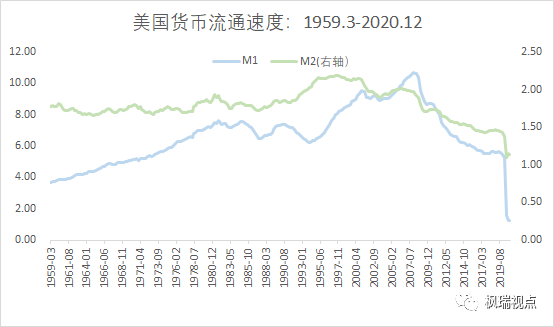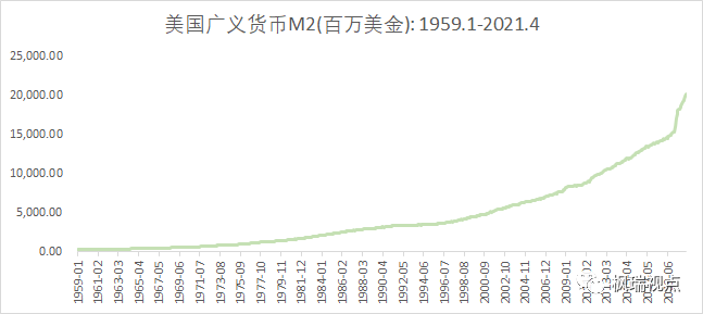 新冠危機(jī)和08年金融危機(jī)美聯(lián)儲(chǔ)放水的效果有很大不同。2020年3月疫情發(fā)生后,美國(guó)狹義貨幣M1從2020年2月底的3.4萬(wàn)億美金(下同)上升到2021年4月底的6萬(wàn)億,11個(gè)月間上升75%(圖一);同期M2(即銀行存款加上現(xiàn)金)從1.5萬(wàn)億上漲到2萬(wàn)億,上漲32%(圖二)。對(duì)照2008年8月底,基礎(chǔ)貨幣接近8500億,到2009年9月上漲到1.8萬(wàn)億,上漲121%;而同期廣義貨幣M2僅上漲了8.4%。本輪危機(jī)中M2增速超過(guò)金融危機(jī)期間的增速,主要是因?yàn)楸敬挝C(jī)后美聯(lián)儲(chǔ)將資金直接發(fā)放到消費(fèi)者手中。而2008年美聯(lián)儲(chǔ)是將資金發(fā)給銀行,并且對(duì)存在銀行的超額儲(chǔ)備金支付利息,導(dǎo)致這些錢一直存在銀行賬戶上,沒(méi)有產(chǎn)生貨幣派生,所以M2增速低于基礎(chǔ)貨幣增速。08年以來(lái)雖然美國(guó)放水不少,但通脹一直保持在較低水平,這是一個(gè)原因。新冠疫情發(fā)生后,美國(guó)貨幣流通速度直線下降,M1的貨幣流通速度從2020年3月底的5.25下降到2020年底的1.22(圖三),而同期M2 的貨幣流通速度從1.38下降到1.13,M1和M2流通速度的降幅分別為77%和18%。而2008年金融危機(jī)期間,M1和M2的流通速度分別從2008年9月份的10.37和1.9下降到2009年9月份的8.67和1.7,分別下降了16.8%和8.4%。本次危機(jī)貨幣流通速度大幅下降因?yàn)橐咔椴淮_定性導(dǎo)致老百姓手握巨額現(xiàn)金而不敢花錢。隨著疫情緩解,美國(guó)消費(fèi)者加大支出,低利率、低通脹和低增長(zhǎng)的時(shí)代可能即將過(guò)去。